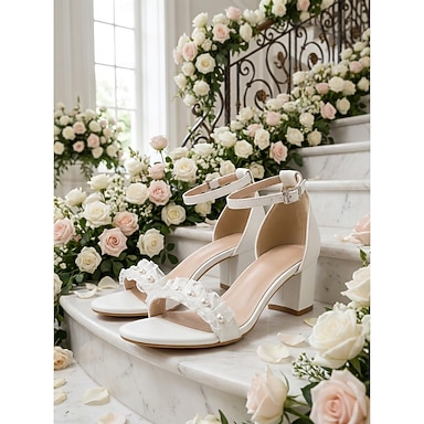 Sandales blanches à talons carrés et bride cheville, ornées de fleurs, pour femme ; chaussures de mariée romantiques pour un mariage en plein air dans un jardin.