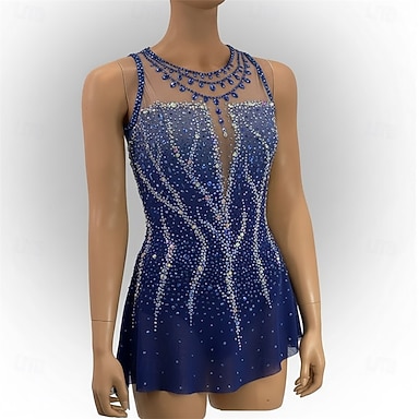 Robe de patinage artistique pour femmes et filles, bleue, extensible, pour entraînement, compétition, vêtements de patinage, thermique, chaud, cristal/strass, sans manches, patinage artistique