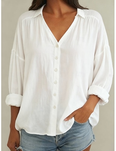 Femmes Chemise Chemisier Chemise en faux lin Uni ancien Classique Moderne manche longue Col en V Hauts Réguliers Quotidien Fête Sortir Bleu Blanche Rose Claire Gris Été Printemps