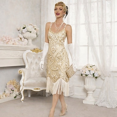 Set Années Folles Années 1920 Mi-long Robe Charleston Tenues Robe de Bal avec accessoires Épaules dénudées Gatsby le Magnifique Invité au mariage Paillettes Frange à pompons Plume Col en V Déguisement
