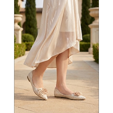 Ballerines fleuries champagne pour femme, à la finition texturée, élégantes chaussures de mariée pour un mariage en plein air dans un jardin.