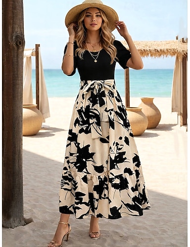 Femmes Robe maxi Robe trapèze Occasionnel Extérieur Sortir Coupe régulière Fleuri Manche Courte Col Rond Abricot Été Printemps