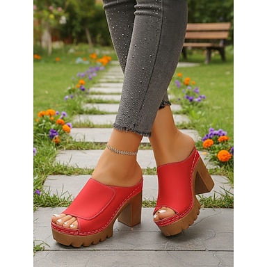 Sandales mules rouges à plateforme et talon bloc pour femmes – sandales à bout ouvert et semelle épaisse, idéales pour l'été, les voyages et les garden-parties.