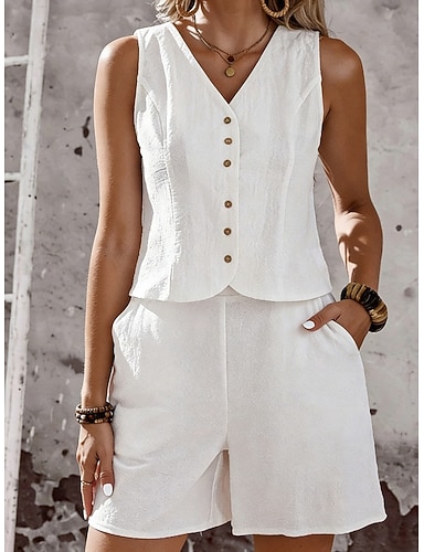 Femmes Ensembles en coton et lin Ensembles de Shorts Sans manches Col en V Uni Mode Streetwear Occasionnel Quotidien Extérieur Blanche Orange Vert Été Coupe Ample