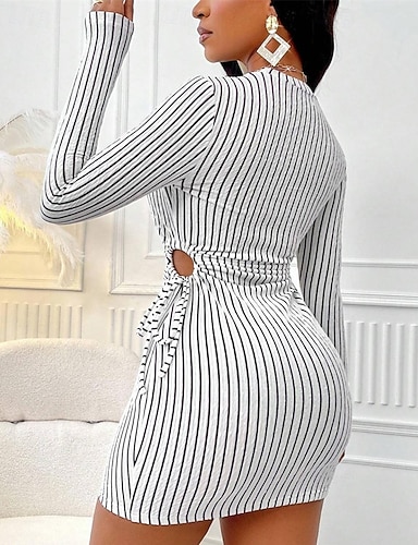 Femmes Mini Robe Robe Décontractée Moulant Mode Classique Moderne Extérieur Vacances Fête Coupe régulière Rayé manche longue Col ras du cou Blanche Été Printemps