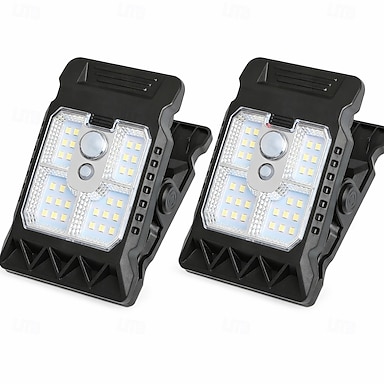 Lot de 2 lampes solaires à pince pour extérieur avec détecteur de mouvement, étanches, 3 modes d'éclairage de sécurité, éclairage de secours portable pour jardin, portail, terrasse, camping