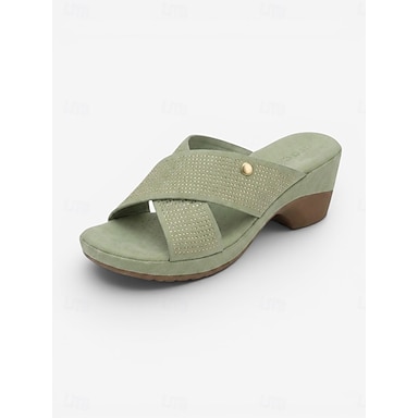 Sandales compensées à brides croisées et strass verts pour femme – mules confortables à enfiler avec semelle intérieure rembourrée et talons ouverts scintillants, idéales pour les vacances et les