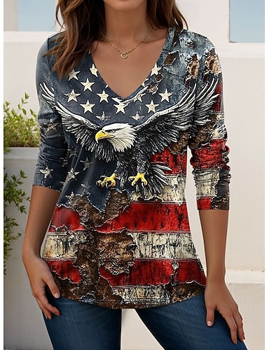 Jour de l'Indépendance Américaine Femmes T-shirt Imprimé Graphique Drapeau Américain ancien Élégant Classique manche longue Col en V Hauts Réguliers Quotidien Week-end Bleu Noir Blanche Rouge Ét