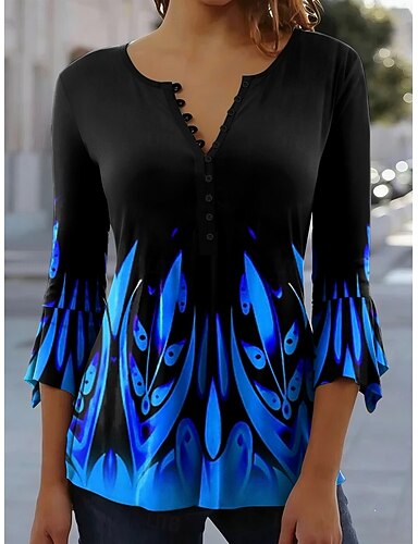 T-shirt Femme Graphique Abstrait Élégant Vintage Élégant Manches 3/4 Col en V Tops Réguliers Quotidiens Sortie Volants Boutons Bleu Bleu Royal Violet Vert Été Printemps