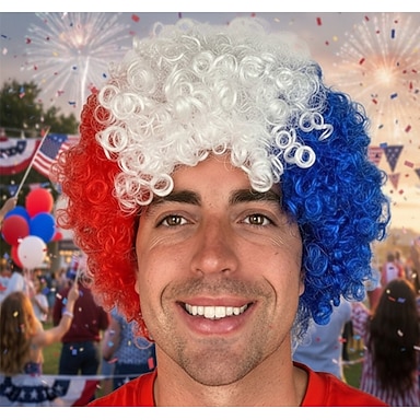 Perruques bouclées du 4 juillet rouge blanc et bleu perruque bouclée naturelle résistante à la chaleur synthétique pour cosplay fête costume