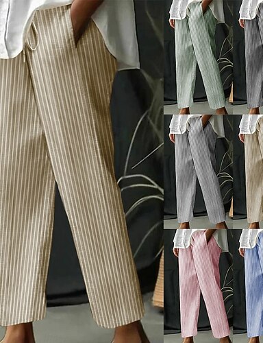 Femmes Faux coton lin Pantalons Pantalon décontracté Pantalon d'été Vacances Mode Streetwear Longueur cheville Taille haute Rayé Avec Poches Taille Élastique Confortable Non Elastique Quotidien