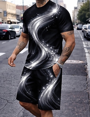 Homme Géométrique Ligne 2 pièces Ensembles de tees Hauts d'été Manche Courte Pantalon court Col ras du cou Sport Décontracté Quotidien Occasionnel Extérieur Vacances Sortir Impression 3D Été Bleu