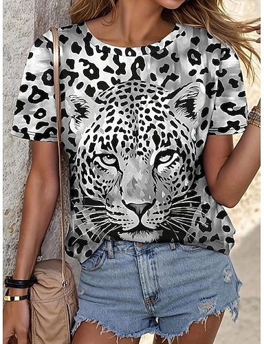Femmes T-shirt Imprimé Graphique Léopard ancien Élégant Occasionnel Manche Courte Col ras du cou Col rond Hauts Réguliers Occasionnel Quotidien Noir Arc-en-ciel Été Printemps