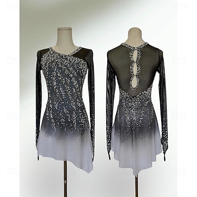 Robe de patinage artistique Femmes Fille Patinage Robe gris foncé Patchwork Trou de pouce Spandex Maille Haute Élasticité Entraînement Compétition Tenue de Patinage Classique cristal pailleté manche