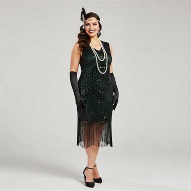 Set Années Folles Années 1920 Mi-long Robe Robe Charleston Tenues avec accessoires Mancheron Gatsby le Magnifique Invité au mariage Frange à pompons Col en V Col Rond Déguisement Femmes Carnaval