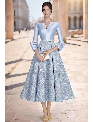Ligne A Longueur thé Robes de Cocktail Robes de soirée Élégant ancien Manche 3/4 Col en V Mariage Formel Taffetas Jacquard avec Noeud(s) Plis