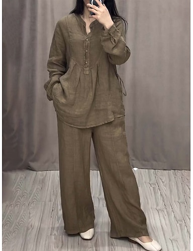 Homme Chemise en lin Deux pièces Ensemble Chemise Et Pantalons en Lin Pantalons Pantalon décontracté Set Uni Quotidien Extérieur Vacances Col grand-père manche longue Été Printemps Mode Occasionnel