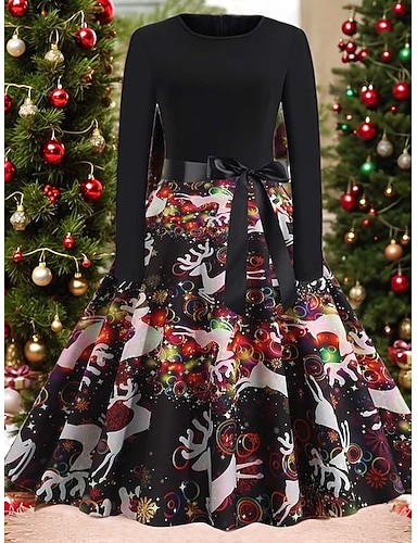 Robe midi femme avec renne robe fourreau robe en ligne élégante bohème mignonne fête à domicile nouvel an ajustement régulier graphique Claus à manches longues col rond coloré noir bleu violet