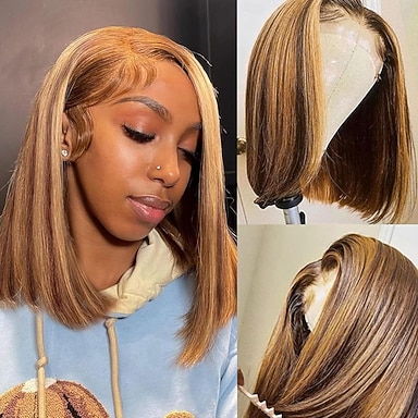 Perruque Cheveux vierges non transformés 13x4 devant en dentelle Cheveux Brésiliens Ondulé Noir Multicolore Bob court Femme Densité 130% 150% avec des cheveux de bébé Cheveux Colorés Ligne de Cheveux
