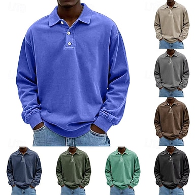 Homme Polo Chemise 100% coton délavée à l'acide Classique manche longue Occasionnel Sport Tenues de Sport Respirable Doux Boucle Lavage à l'acide Lavage vintage Couleur Unie Bleu Noir Tenues de Sport