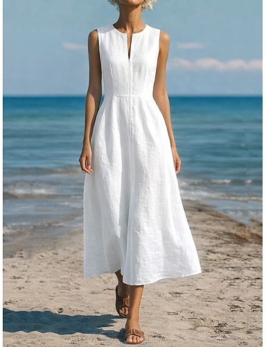 Robe maxi en lin-like pour femmes en faux coton robe en A robe d'été décontractée quotidienne coupe régulière sans manches col en V blanc été