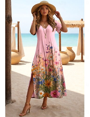 Femmes Robe Maxi Robe en Chiffon Robe Fleurie Robe Imprimée Élégant Mode Moderne Quotidien Extérieur Vacances Coupe régulière Fleuri Manche Courte Col en V Rose Claire Été Printemps