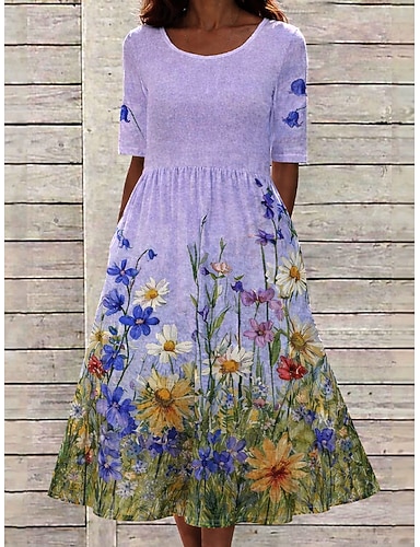 Femmes Robe Midi Robe Décontractée Robe Ensemble Mode Moderne Quotidien Plage Week-end Coupe régulière Fleur Demi Manches Col en V Bleu Vert Claire Rose Claire Rouge Printemps Automne