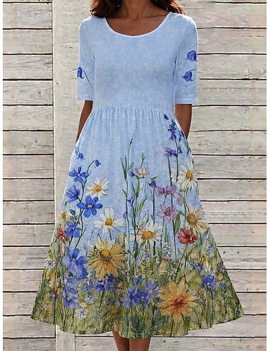 Femmes Robe Midi Robe fourreau Vacances Occasionnel Boho Quotidien Robe d'Été Robe de Printemps Coupe régulière Fleuri Graphique Demi Manches Col ras du cou Bleu Blanche Rose Claire Bleu Ciel Ét