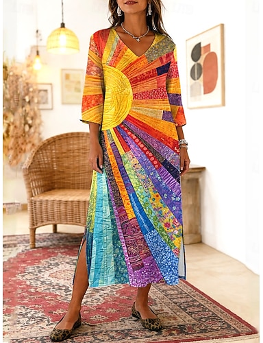 Femmes Robe maxi Robe bohème Robe fourreau Robe d'Été Robe de Plage Bohème Vacances Ethnique Plage Fête Date Coupe Ample Graphique Abstrait Manche 3/4 Col en V Bleu Orange Été Printemps