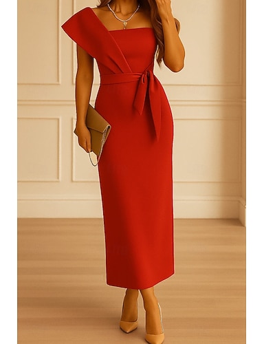 Fourreau Colonne Longueur cheville Longueur thé Robes de Cocktail Élégant Sans manches Épaules Dénudées Fête de jardin Mariage Crêpe Extensible avec Noeud(s) Plis