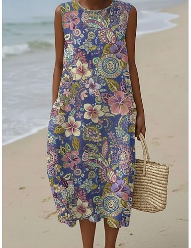 Femmes Robe Midi Robe Décontractée Robe d'Été Robe fourreau ancien Quotidien Extérieur Vacances Coupe Ample Fleuri Sans manches Col ras du cou Bleu Été Printemps