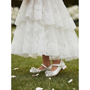 Chaussures Mary Jane pour enfant, avec bride perle, petit talon bloc, nœud en strass et doublure douce, élégantes chaussures de princesse pour petites filles, parfaites pour les cérémonies de mariage.