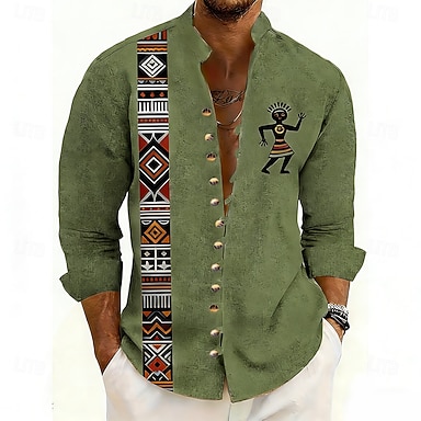 Homme Géométrique Ethique / Africain Peuples autochtones Chemise Chemise à col montant manche longue Vintage Rétro Occasionnel Vacances Printemps Automne Col mandarin Band Collar Boutonné Chemise en