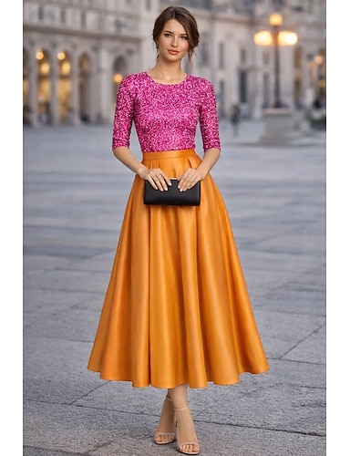 Ligne A Longueur thé Robes de Cocktail Élégant Bloc de Couleur Scintillant manche longue Col ras du cou Mariage Formel Poche Satin Pailleté avec Plis Paillettes