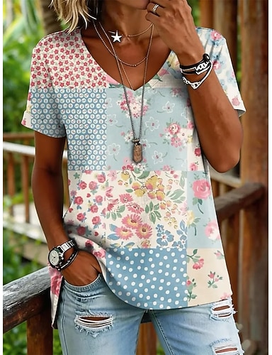 Femmes T-shirt Imprimé Fleuri Graphique Mode Élégant Classique Manche Courte Col ras du cou Col rond Hauts Réguliers Occasionnel Quotidien Week-end Bleu Blanc / Noir Vert avec beige Blanche Jaune Ét