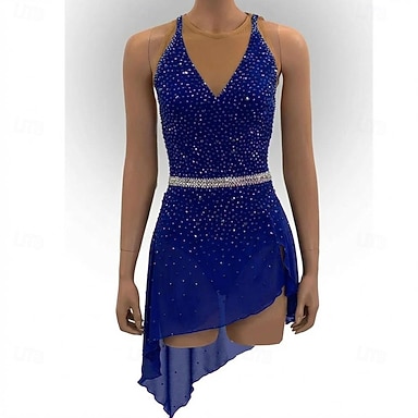 Robe de patinage artistique Femmes Fille Patinage Robe Tenues Bleu + Bleu ciel Patchwork Ourlet asymétrique Spandex Maille Haute Élasticité Compétition Tenue de Patinage cristal pailleté manche longue