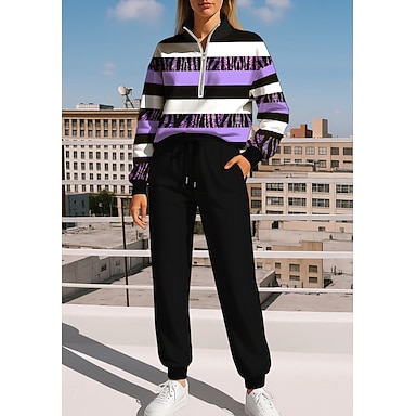 Femmes Sweat-shirt Ensemble Survetement Survêtement Cordon de serrage Fermeture éclair Géométrique Veste et Pantalon de Jogging Ensemble de vêtements de sport Printemps Automne Hiver Violet