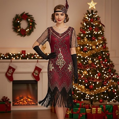 Set Gatsby le Magnifique Fille Flapper Robe Charleston Robe de Noël Robe de cocktail avec accessoires Femmes Années Folles Années 1920 Franges à pompons Paillettes Motif Robe Elégante Adultes Noël