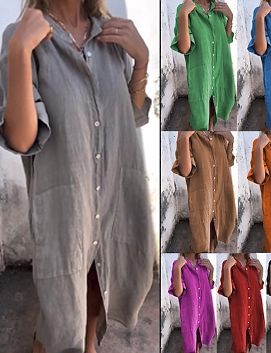 Robe maxi femme en faux coton et lin, robe chemise, robe t-shirt, coupe ample décontractée, manches courtes, col chemise, bleu, noir, rouge, violet, été, printemps
