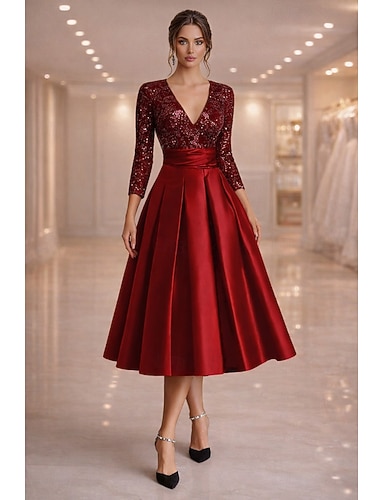 Ligne A Longueur thé Broderie perlée Robe de Cérémonie Robe de la mère de la mariée Robes de Cocktail Robes de soirée Élégant Éclat Manche 3/4 Col en V Noël robe demoiselle d honneur Satin Velours