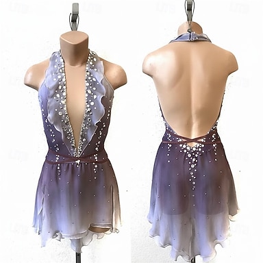 Robe de patinage artistique Femmes Patinage Robe Violet Patchwork Dos Nu Spandex Maille Haute Élasticité Entraînement Compétition Tenue de Patinage Classique cristal pailleté Sans manches Patinage