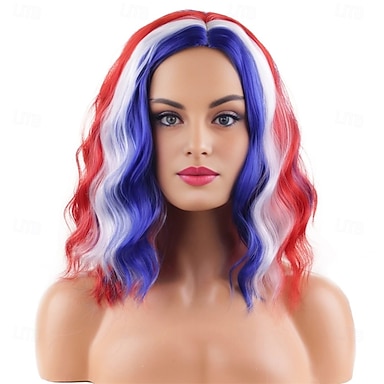 Perruque drapeau du 4 juillet pour femmes perruques courtes bouclées rouges blanches et bleues pour cosplay de fête de l'Indépendance
