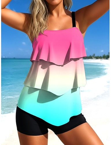 Maillot de bain femme tankini 2 pièces colorblock taille haute volants superposés dos nu vêtements de plage de vacances ombre graphique col en U sans manches