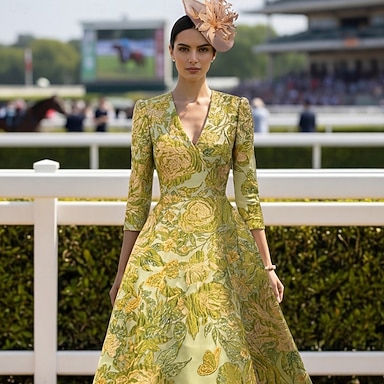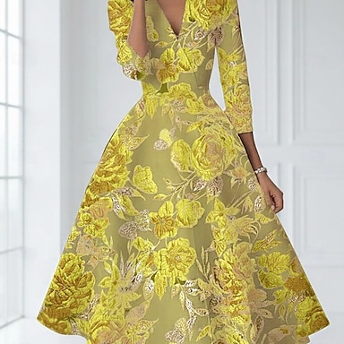 Ligne A Longueur cheville Robe de Soirée Robe de Cocktail Robe d'invité de mariage Robe de Mère de Mariée Manche 3/4 Col en V Col de chemise Élégant ancien Formel Satin Jacquard avec Dentelle