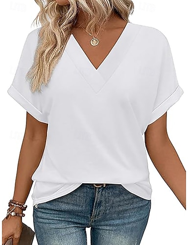 Femmes T-shirt Uni Mode Élégant Classique Manche Courte Col en V Hauts Réguliers Quotidien Sortir Week-end Bleu Noir Blanche Rouge Été Printemps