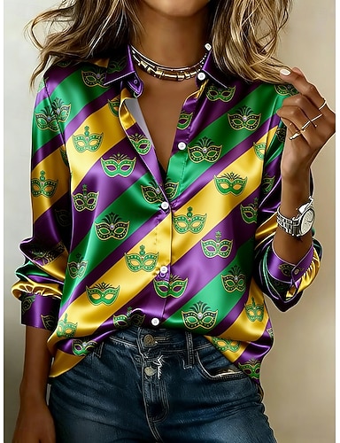 Mardi Gras Femmes Chemise Graphique Géométrique ancien Élégant Moderne manche longue Col de chemise Hauts Réguliers Quotidien Fête Violet Vert Été Printemps