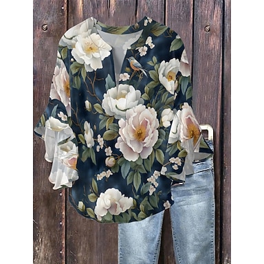 Femmes Chemisier A Volants Imprimé Fleuri Élégant Moderne Manche 3/4 Col en V Hauts Réguliers Quotidien Fête Bleu Vert herbe Rose Claire bleu marine Vert Été