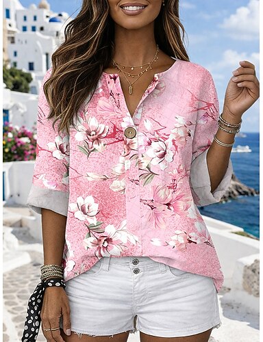 Femmes Chemisier Imprimé Fleuri Graphique ancien Élégant Moderne Manche 3/4 Col ras du cou Hauts Réguliers Quotidien Fête Tenue de plage Jaune Rose Claire Violet Vert Été Printemps
