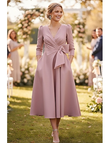 Ligne A Longueur thé Robe de Soirée Robe de Cocktail Robe d'invité de mariage Robe de Mère de Mariée Manche 3/4 Col en V Élégant ancien Formel Satin avec Noeud(s) Froncé