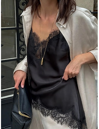 Femmes Chemisier Débardeur caraco T-shirt sans manches Garniture en dentelle Uni Élégant Sexy Classique Sans manches Col en V Hauts Réguliers Quotidien Fête Sortir Noir Jaune Bleu clair Été Printemps